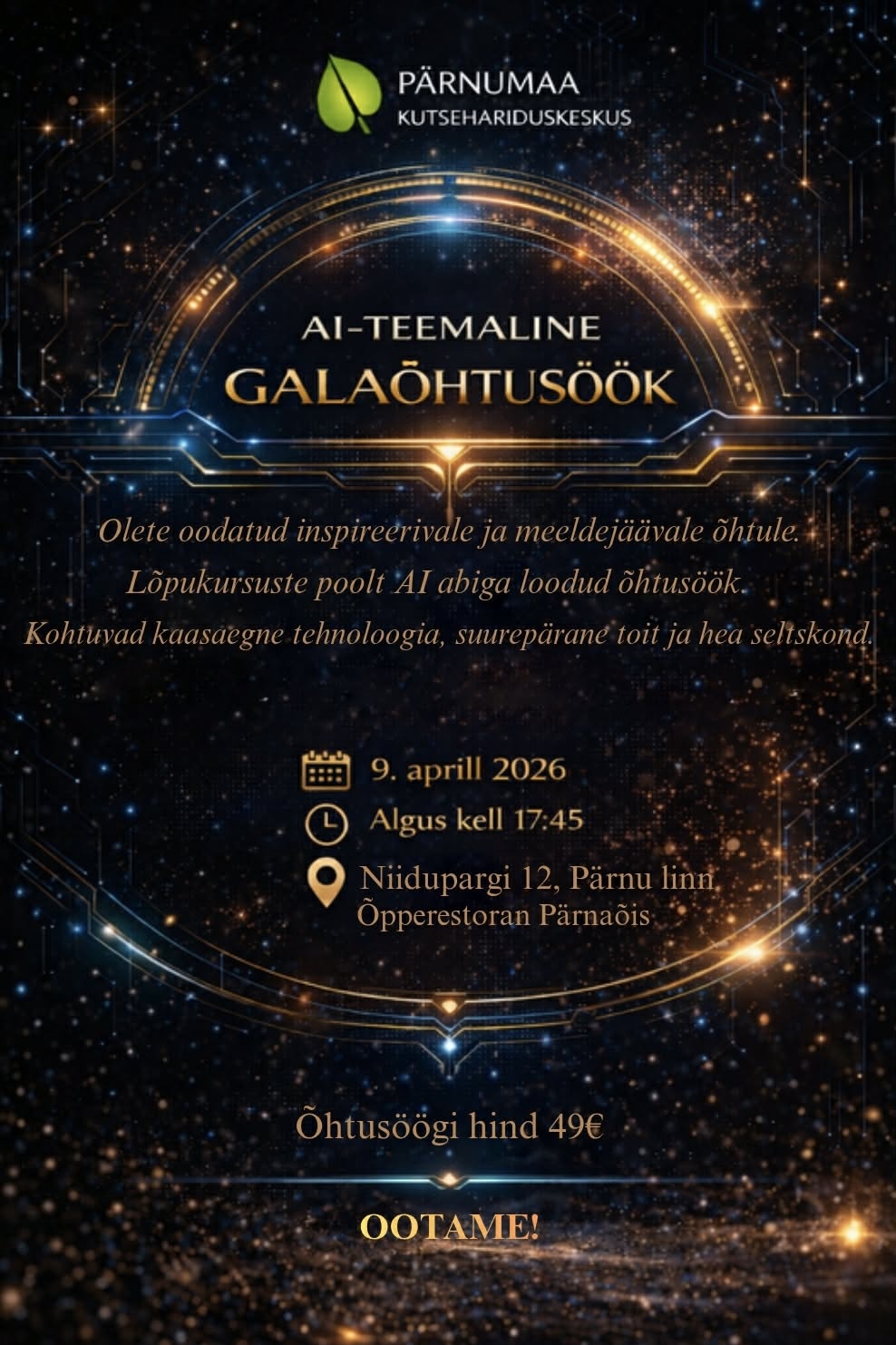 Ootame teid Pärnumaa Kutsehariduskeskuse lõpukursuse õpilaste valmistatud AI-temaatilisele galaõhtusöögile.