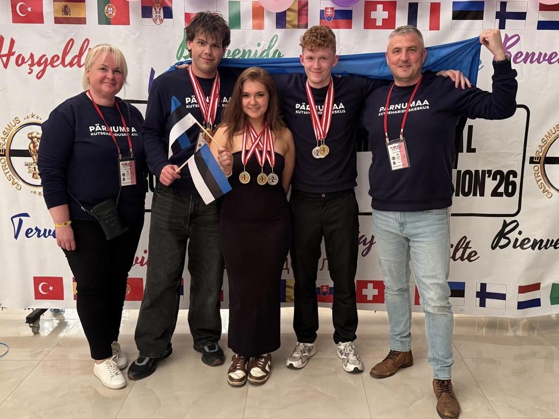Kendrik Raidlepp (koka eriala 2. kursus), Mona Maribel Voolaid ja Mattyas Hansalu (koka eriala 3. kursus) ning õpetajad Sergei Tšekmarjov ja Terje Jürgens.