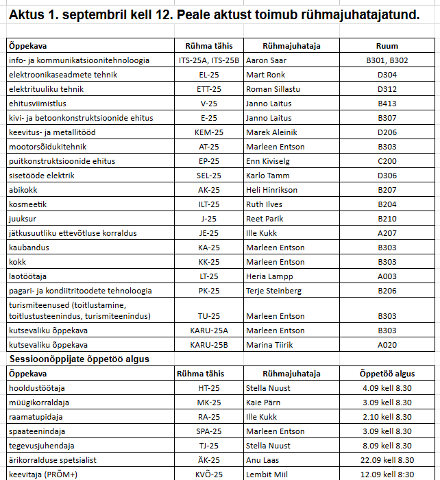 Aktus toimub esmakursuslastele, jätkukursustel õppijatel toimub õppetöö tunniplaani alusel. I kursuse sessioonõppijate õppetöö algab I sessioonil, õppesessioonide ajad.