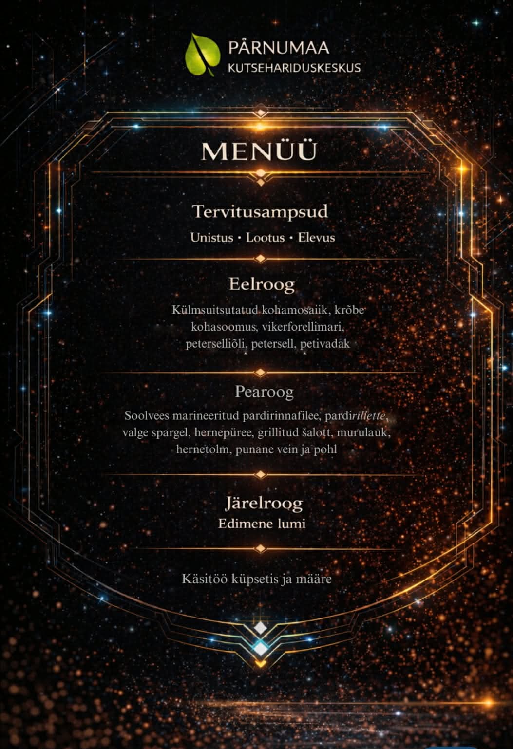 Ootame teid Pärnumaa Kutsehariduskeskuse lõpukursuse õpilaste valmistatud AI-temaatilisele galaõhtusöögile.